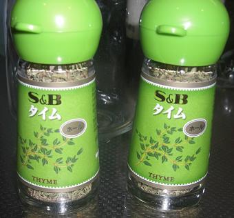 昨日、作り方をご紹介したタイムチンキですが・・・ タイムはどこに売ってるの???とか、質問がありましたので、写真でご紹介!! 食用ドライハーブのタイムとは・・・そんなたいした物ではなく、スーパーの香辛料売り場にあるこんなやつでいいんです!注意するのは粉(パウダー?)になっているやつじゃなくて・・・なんていうのかな~・・・粒のままっていうか・・・ こんなのです・・・(あ!S&Bじゃなくても、もちろんいいんですよ(笑)) それと、アルコール度数が40度のウォッカ!! これ、1瓶あれば相当量のタイムチンキが出来ます(笑)とっておいて、来年に使うもよし飲んでしまうもよし・・・(笑) で、イチゴジャムの瓶とかに入れる・・・ ウォッカの量は、ヒタヒタですよ~ あとは、ひたすら毎日フリフリしながら3~6週間待つだけです どうです?簡単でしょ?(笑)