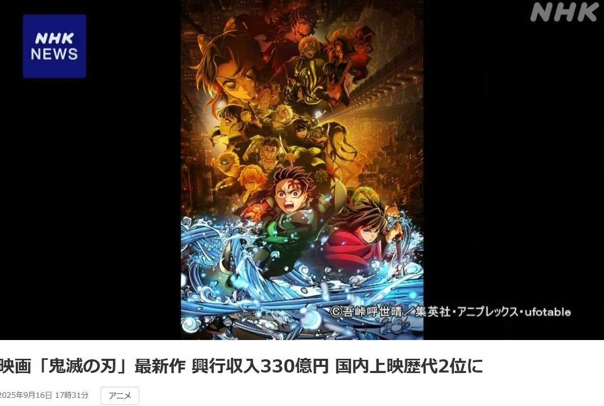 今朝テレビを見ていると、『鬼滅の刃』興収330億円突破 『千と千尋の神隠し』抜き歴代2位!前作超えペース維持で全世界興収は680億円突破とのニュースが流れました。予想を超え、素晴らしい興行収入で、驚かされます。竈門炭治郎を演じた花江夏樹さんも嬉しそうです。2023年2月3日、『ワールドツアー上映「鬼滅の刃」上弦集結、そして刀鍛冶の里へ』の公開記念にあわせ、浅草寺で行われる「節分会」(せつぶんえ)にサプライズ登場し、他キャストとともに観客に向けて豆まきするのを目の当たりにして、ちょっと遠いツーショットが実現したのを思い出します。益々のご活躍を祈っております。FMilovecb・・・・・・・・・・・・・・・・・・・・・・・・・・・・・・・・・・・・・・・・<■『鬼滅の刃』興収330億円突破 『千と千尋の神隠し』抜き歴代2位!前作超えペース維持で全世界興収は680億円突破 9/16(火) 12:00オリコン配信 アニメ『鬼滅の刃』の最新作となる劇場版『鬼滅の刃 無限城編 第一章 猗窩座再来』(7月18日公開)の興収情報が発表された。公開60日間で観客動員2304万2671人、興収330億5606万6300円を突破し、国内歴代興収は『千と千尋の神隠し』の316.8億円(2001年)を抜き、2位にランクインした(興行通信社調べ)。また、日本を含む全世界で累計観客動員5500万4375人、総興行収入680億1524万3965円を記録したことが、『鬼滅の刃』公式Xより発表された。 9月12日に公開開始となった北米では、歴代No.1となる日本アニメ映画オープニング記録「観客動員600万8511人・興行収入7060万ドル(約102億3700万円/1ドル=145円換算)」を達成し、26年ぶりに記録を更新。9月11日~12日に公開開始となったその他海外各地域においても、様々な記録を更新している。 劇場版『鬼滅の刃 無限城編 第一章 猗窩座再来』は、公開3日間で興収55.2億円を突破し、日本で公開された映画史上でオープニング成績、初日成績、単日成績という3つの記録を更新。 さらに興収100億突破は公開から8日間(「無限列車編」は10日間)、興収200億突破は公開から23日間(「無限列車編」は24日間)、興収300億突破は公開から46日間(「無限列車編」は59日間)で、国内歴代1位となる興収407.5億円を突破した前作『劇場版「鬼滅の刃」無限列車編』(2020年10月公開)を上回る興収ペースを維持しており、歴代1位の記録更新も十分に狙える。 今回の大ヒットに配給のアニプレックスは「劇場にお越し頂いたお一人おひとりに、そして、作品を届けて下さっている劇場関係者の皆様に心より御礼申し上げます」とファンに感謝している。 『鬼滅の刃』は、2016年2月から20年5月まで『週刊少年ジャンプ』で連載していた人気漫画が原作で、大正時代の人喰い鬼の棲む世界を舞台に、家族を鬼に殺された少年・竈門炭治郎が、鬼になった妹の禰豆子を人間に戻すため<鬼殺隊>へ入隊し、家族を殺した鬼を討つ姿を描いた物語。コミックスの全世界累計発行部数は2億2000万部を突破している。 2019年4月から9月にかけてテレビアニメ「竈門炭治郎 立志編」が放送され、大きな話題となり、『劇場版「鬼滅の刃」無限列車編』が2020年10月に公開。全世界での興行収入は約517億円を突破するなど社会現象となった。 その後、ゲーム化や舞台化もされ、2021年12月にテレビアニメ「遊郭編」、2023年4月に「刀鍛冶の里編」、2024年5月~6月に「柱稽古編」が放送。そして劇場版『鬼滅の刃 無限城編』が3部作で制作され、『劇場版「鬼滅の刃」 無限城編 第一章 猗窩座再来』では、炭治郎たち“鬼殺隊”が鬼の根城<無限城>を舞台に、宿敵・鬼舞辻無惨、上弦の鬼との最終決戦が描かれる。・・・・・・・・・・・・・・・・・・・・・・・・・・・・・・・・・・・・・・・・【今日のLifeHack:嘘のような本当の出来事に出会った時、どんな人でも心を動かされます。それは一瞬でも人々に「和」をもたらします。それはどんな教育にも勝る、樹木希林】<NHKニュース><2023年2月3日、「鬼滅の刃」への公開にあわせ、浅草寺でサプライズ登場><竈門炭治郎を演じた花江夏樹さん>
