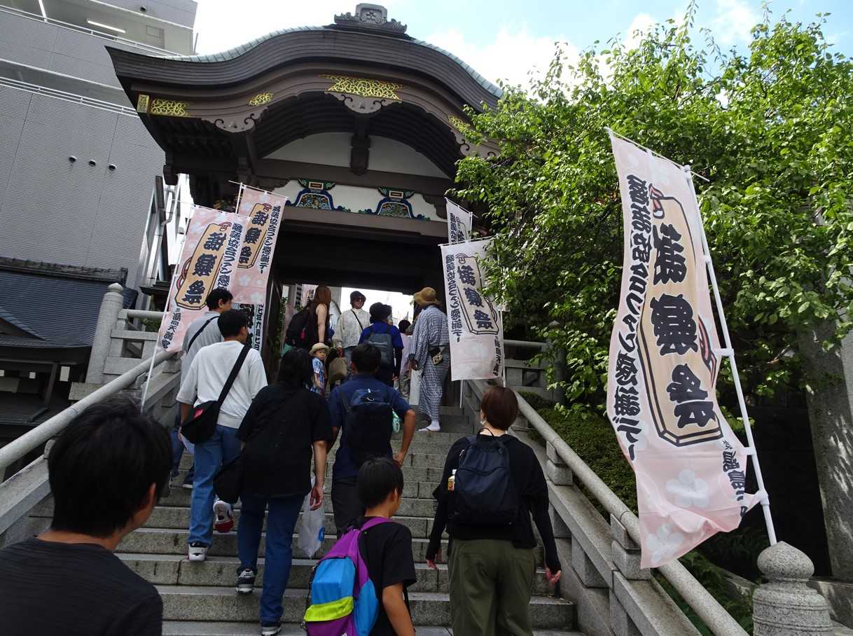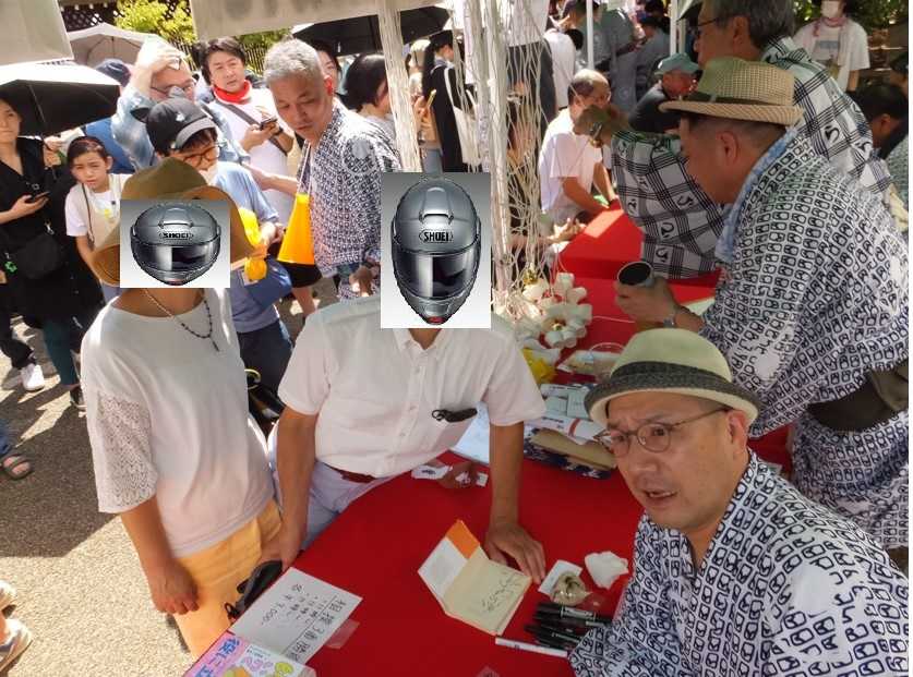湯島天満宮の「落語協会謝楽祭」 in 2015。太鼓橋での、落語協会会長の柳家さん喬師匠、実行委員長の柳家三三師匠、そして林家正蔵師匠、のご挨拶が終わり、目的の一之輔 師匠のブース?、出店に近づこうとすると長い列、なんと最後尾は先ほど登ってきた石段「夫婦坂」の下、更にその先まで並んでいます。・・・暑い中・・・知っている人、慣れている方は、お練りや挨拶を無視して、並び始めたようです。流石です。そして、そして、やっと一之輔 師匠の出店、握手ツーショットに成功です。折角にチャンスなので、カメラのシャッターを何度も押していたら・・・一之輔師匠から「何枚撮るんだよーーー」と言われ、つい100枚と返しましたが、「座蒲団、10枚」と応えておけば良かったと・・・後から思い・・・・・・この日の夕方に放送される「笑点」を意識して・・・【今日のLifeHack:言葉ってものは、傷つけもするし、幸せにもする単純な文法です、樹木希林】<春風亭一之輔師匠は人気者、我々が終わった後も、石段の下までの長い列が・・・><笑点メンバーと>