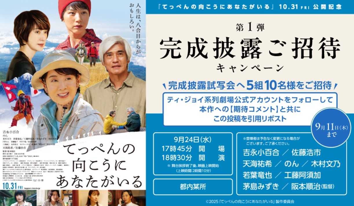 ・・・映画は映画館で観るに限る、映画館以外では観ない。・・・去る9月10日、橋幸夫さんの葬儀・告別式に、吉永小百合さんが参列されなかったので、目の当たりにすることは出来ず、当然お話する機会も無く、残念に思っていました。2011年に彼女を目の当たりにしてから12年が経った頃、東日本大震災を切っ掛けに、坂本龍一さんの呼びかけで編成された「東北ユースオーケストラ」のコンサートを知り、2023年からは、毎年、彼女を目の当たりにしています。そんな時、大人の休日倶楽部主催で10月8日に、JR福島駅近くで映画『てっぺんの向こうにあなたがいる』の舞台挨拶付き特別試写会に400名招待との記事を見て、遠いので迷っていたら妻から「福島に行って来たら」と言われたもの決断出来ずにいました。そこへ、その日より早い9月24日に、国際フォーラムで開催の舞台挨拶付き試写会募集を見つけ、応募したところ、みごと当選したハガキが届きました。更に2名まで有効です。・・・幸運の女神が微笑んだようです、吉永小百合さんが微笑んだ?ようで・・・有り難いことです。9月24日の映画『てっぺんの向こうにあなたがいる』の舞台挨拶付き試写会が楽しみです。また、1975年、女性初のエベレスト登頂に成功した登山家の田部井淳子さんが、2009年1月10日に開催された講演会を最前列で聴講したのを思い出します。・・・・・・・・・・・・・・・・・・・・・・・・・・・・・・・・・・・・・・・・<■映画『てっぺんの向こうにあなたがいる』1975年、女性初のエベレスト登頂に成功した登山家の多部純子/<田部井淳子役>(吉永小百合)は、女性登山家のパイオニアとして注目を浴びる。次々と山に挑戦する純子だが、そんな彼女に反発する息子・真太郎とのすれ違いや登山仲間との決別に悩み、病にも襲われる。しかし東日本大震災で被災した高校生たちの様子に心を痛めた純子は、病を押して富士山に登ることを決意し、自分の姿を通して彼らを励ますプロジェクトを立ち上げる。純子の夫・正明(佐藤浩市)は、純子とすれ違ったままの真太郎にプロジェクトへの参加を持ち掛ける。登山家・田部井淳子のエッセイ「人生、山あり“時々”谷あり」を原案にしたドラマ。女性初のエベレスト登頂を果たした登山家が、家族との衝突や登山仲間との別れ、病との戦いを乗り越えながら、山に登り続ける。メガホンを取るのは『冬薔薇(ふゆそうび)』などの阪本順治。阪本監督作『北のカナリアたち』などの吉永小百合、『私にふさわしいホテル』などののん、『LOVE LIFE』などの木村文乃のほか、若葉竜也、天海祐希、佐藤浩市らが出演する。出典:シネマトゥデイ・・・・・・・・・・・・・・・・・・・・・・・・・・・・・・・・・・・・・・・・【今日のLifeHack:(吉永)小百合さんは見かけよりもずっと頑固ですから、樹木希林】<・・・幸運の女神が微笑んだようです、吉永小百合さんが微笑んだ?ようで・・・><2009/1/10><夫・田部井政伸さんの著書><橋幸夫さんの葬儀に現れず、お話出来なかった吉永小百合さんは、弔電を><田部井淳子さんの著書><2023年の吉永小百合さん><2024年の吉永小百合さん><2025年の吉永小百合さん>><完成披露試写会の招待状>