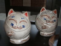 ・・・皆さんのブログを訪問するたびに、あれもこれも、気になってます。どこかへ出かけていくたびに、「カエルさん」だったり、「招き猫」だったり・・・見つけちゃうとつい欲しくなってしまいます。そして、また、あっちこっちさがしてみたりで・・・ これも「招き猫」(?)ここは、以前紹介したことがある呉服屋さんですが、今回は陶芸作家さんが来てて、ちょっとお遊び・・・ 粘土をこねさせてもらいました。コレが私の作品 朝のコーヒーやお茶の器にと・・・焼きあがるのが楽しみです。