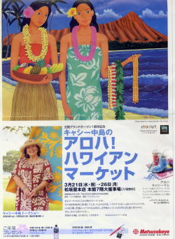 21-26日と、名古屋松坂屋でイベントがありました。25日と26日には、私たちの教室の先生と仲間が出演するので、教室のみんなと出かけました。25日にはキャシー中島のトークショーもあり、大勢の人だかりでした。 私たちの先生です。かわいいでしょ。名古屋とその周辺に教室があり、生徒は小さな子(4歳)~おばさん(^_^;)まで。私たちのクラスは、市の講座から始まったもので、平均年齢は一番上じゃないかな人数も一番多いようです。みんな、わきあいあい、終わってからもお茶におしゃべりで時間を忘れています。フラ→踊ることで脳・体のため・・・なんて言いながら、ほんとは、ただ、楽しんでいるだけです。
