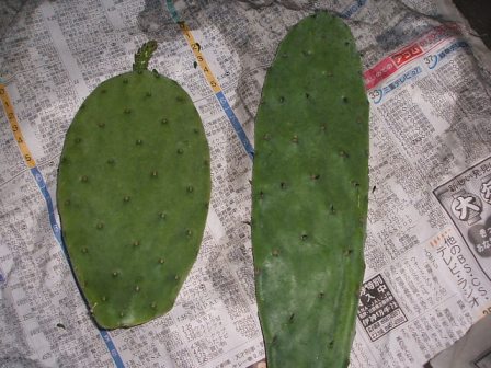 友人から食用サボテンをもらいました。さて、どうしたものか??サボテンステーキというのは聞いたことがあるような トゲは普通のサボテン(?)より少ない。そお~~っとトゲと皮を包丁でむいて、少し切って食べてみる→とてもあおくさい!(さやえんどうをそのまま食べたような感じ)さっと湯通ししてみたら、ぐにゅ~っとなって、切ってみるとオクラのような粘り気が出て・・・<サボテンのサラダ>を見つけました。そして、サボテンの効能も・・・ただ、おいしいからお勧めというわけではありません。機会があったらどうぞお試し下さい。