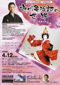 御園座の演劇以来というわけではありませんが、和物(?)見てます。今月初めには、御園座「春陽歌舞伎」市川海老蔵見てきました。(あとから日記はUPするつもりですが・・・)今日は、市川亀治郎見てきました。愛知県扶桑町、扶桑文化会館です。(人口3万人の町に、すばらしい施設です。)「ふそう文化夢応援団 15周年記念」「市川亀治郎の世界」~トーク&舞踊公演~一部は「越後獅子」その後対談歌舞伎公演のこと、テレビや映画出演のこと、ロンドンでの「十二夜」のことなど・・・画像を見ながらの、楽しいお話でした。NHKテレビで武田信玄を演じてから、立ち役の低い声での演技にも自信が付いて、役の幅が広がったと言われていました。ご自分の勉強会「亀治郎の会」を立ち上げ、あえて、自分の苦手を演じたり、いろいろなことに挑戦されているそうです。聞いていると、どの公演も見たくなってしまいます。が・・・・・残念なことに、名古屋やその近郊での公演はありませんと、私ならあきらめてしまうのですが、今日の公演へ来ていた人は、地元・扶桑町の人は少なくて、愛知県内の人はもちろん、岐阜県や、関西、遠くは、四国、また関門海峡の向こうからの人も・・・二部「風流船揃」の幕が開いたとたん、客席からは、ため息「まぁ~、きれい!」すばらしい舞台でした。幸せなひとときでした。市川亀治郎さんのHPです。http://www.kamejiro.info/