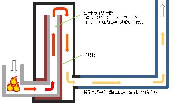 薪ストーブをロケットストーブ化しようと考えたのにはいくつかの理由があるこちらがロケットストーブの模式図である普通にロケットストーブを作ってもよかったんだけど、見てわかる通り焚口=薪の投入口が狭いそのため、何度も薪を投入に行かなくてはいけないし、その感覚は驚くほど短いそこで薪ストーブ自体を焚口と考えて、ロケットストーブ化することを考えたのだが、現段階でその仕上がりは中途半端と言わざるを得ないロケットストーブのもう1つの利点は、火力が強いので煤やタールがほとんど出ないところだ煙突掃除の頻度が減ることも利点であると考えた上図を見ると焚口が断熱されていることが必要なのかもしれないなと気が付いた薪ストーブ内の断熱がうまくいけば、もう少しその性能を引き出すことができるかもしれない事務仕事が終わったので、仕事の合間に試行錯誤が始まるね