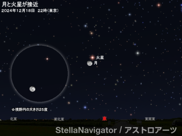 12月18日の宵から19日の明け方、月齢17~18の月と火星が接近して見える。来月12日に地球と最接近する火星はマイナス0.9等級で輝いており、明るい月との紅白共演は見事な光景だ。肉眼や双眼鏡で眺めて、その美しさを堪能しよう。地上の風景と共に撮影するのも面白いだろう。