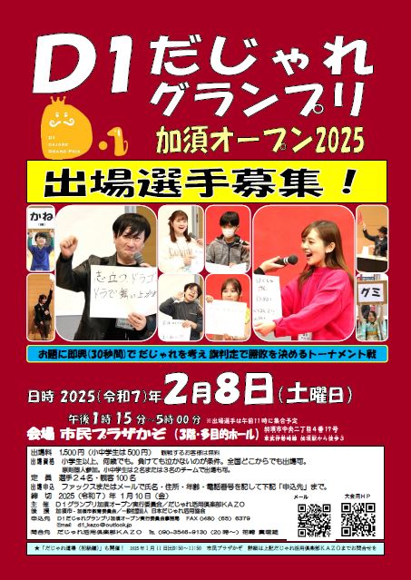 地元の図書館に行った時、入口のロビーで、あるパンフレットが目に入った。それは「だじゃれグランプリ 加須オープン2025」のパンフレット。確か、昨年もあったな。日記に書いたっけ。D1だじゃれグランプリ 加須オープン20252025年2月8日(土) 午後1時15分~5時00分市民プラザかぞ(埼玉県加須市)出場資格 小学生以上、何歳でも。負けても泣かないのが条件。全国どこからでも出場可。 ※小・中学生は、チーム(2名または3名)で出場可。定 員 選手24名・観客100名参加費 一般1,500円 小中学生500円 ※観覧は無料 ↑ ポスターにリンクを貼っておくので、興味のある方はクリックしてみてシルブプレ。