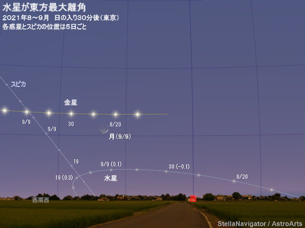 地球の内側を公転する水星は見かけ上、太陽から大きく離れることがないので、日の入り後の西の空か日の出前の東の空にしか見えない。今回のように太陽から東側に最も離れる「東方最大離角」のときには、日の入り後の西の低空に見える。