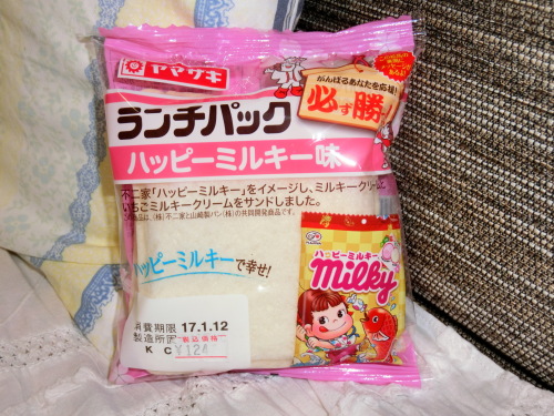 昨日、夜タラタラしてたら1時。もういい加減寝なきゃと思って身の回りを片づけて、最後にコップをシンクへと思って手にしたら、手から零れ落ちて割れた。絨毯の上だったのに割れた。まぢか~~~~><。真夜中に掃除機をかける羽目に・・・・。なんてこったいな。がっかり感ハンパない。【ヤマザキ】ランチパック ハッピーミルキー味 124円ニューデイズで20円引きの時(今日まで?)に104円で購入。ミルキーの言葉に弱い。ミルキークリームといちごミルキークリームをサンド。1枚はそのまま、1枚はトーストして食べた。トーストするほうが断然おいしいね。クリームもとろとろ~ってなるし。ベースは甘いです、甘すぎます。いちごミルキーが最初は邪魔だなぁ~って思ったんだけれど(プレーンなミルキーが大好きなので)、あまりの甘さに苺のほんのちょっとの酸味がありがたく感じてくるので、いちごミルキーはやっぱり必要なんだ。どこから漏れたんだか、携帯に迷惑メールが急に送られてくるようになりました・・・。最近なにに登録しただろうか。イライラ。