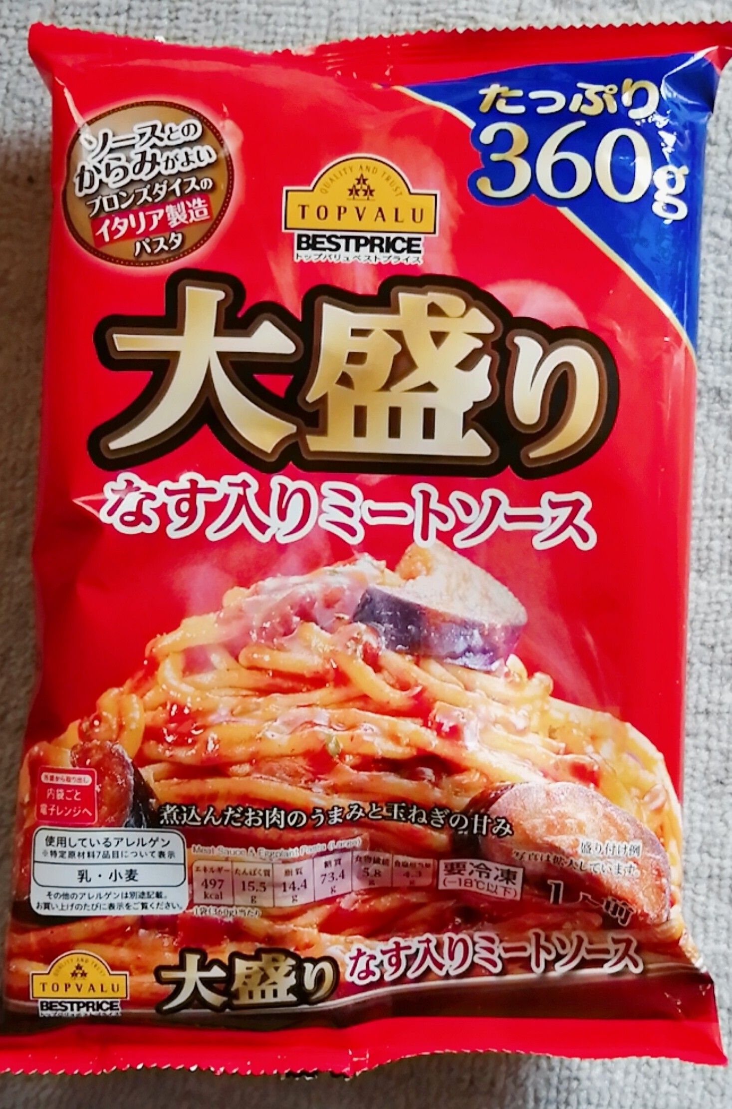 げんき~?自粛モードすごいですね。私も37.5℃熱だしたらコロナじゃなくても自宅待機しなきゃいけないらしいです・・・。厳しすぎる!【トップバリュ】大盛り なす入りミートソースこの間のカルボナーラがおいしかったので他の種類も買ってみた。う~ん・・・微妙。なんだろう、何かが変。パスタかなぁ。なすがうっすいの、半切れで3枚しか入ってないじゃん!!って思ったら写真も半切れ3枚だったわ笑。でもこんなに見栄えしないよ、なんせ半切れの3枚だもの(しかもうっすいの)。「なす入り」って書いちゃうイケナイレベル。前回おいしかっただけにちょっと残念。