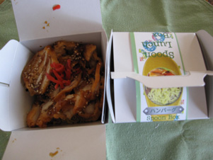 5月某日子供の空手の試合に、ついていき、お昼になった。本を、買ってデパ地下へ。こんなお弁当買いました。 350円でした。美味しかった。ハンバーグは、子供が、鶏肉は、私。トリのほうが、おいしかった。