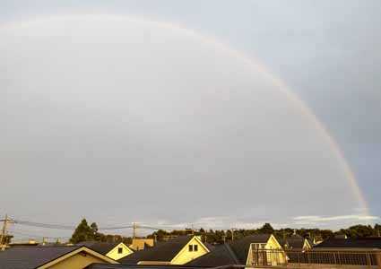 夕方娘から お知らせ虹 が出てると 娘のいるところからけっこう離れてるので(電車で30分くらいかな)見えるかナーーー と庭に出てみたら見える見える おおきーーーーい 雨がポツポツ降ってるので悩んだけど 屋上へ わーーーーメッチャおおきーーーーーーーい 大きくて端まで 写せなかった 小さくする方法 がわから~~~ン よーーく見ると 二重だーーーう~~~ん 性能が悪くてよく写ってないでもおかげで良い物見られた~~