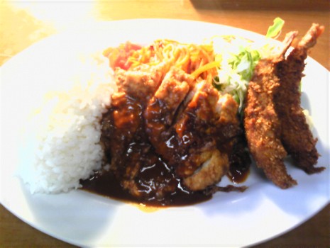 -ソロで行っていないプチ遠征記-『レストラン ハンター で カツライス』本日のプチ遠征は、またまた「レストラン ハンター」です。ウチのお店からもちょうどよい位の距離にあるので行きやすいこともありますが、先日、広島JCの先輩でブログ仲間でもある『○丸ちゃん○』さんが、愛車ハンター・カブを駆って、広島からこのお店「ハンター」に来訪された際、"オススメは何~!?"と聞かれたので、"カツライスっていうのが珍しくて良いと思いますヨ~~!"と答えたのですが、私自身しばらく食べていなかったので、確認も兼ねて行ってみました。[カツライス:¥700]ここで"カツライス"とは・・・、残念ながらもう閉店してしまいましたが、今治の有名な老舗レストランだった「タイガー」の看板メニューで、カツカレーに近いのですが、カレーのルーのかわりに、特製のデミグラスソースがかけられています。ちょうどカレーとハヤシライスの中間の味のような感じですが、これがカツとライスとマッチして、とても美味しいのです。。。思えば今、今治で"カツライス"が食べられるお店は、店主さんがもともと「タイガー」でシェフをしていた、この「ハンター」だけかもしれません。。。[アップで:美味しそう]さて注文して約10分ででてきた"カツライス"ですが、見た目は"カツカレー"とそっくりです。ただ"カツカレー"の方がルーの色が若干黒っぽく、"カツライス"はやや茶色がかっています。ライスと同等量に近いカツは、ボリューム満点ですねぇ、、、そしてすこし濃いめで芳ばしい[すこし焦げているのかも?(笑)]感じのデミグラスソースが、カツとライスにしみこみます。賛否両論あるでしょうが、私はこのソースが結構好きです。が、欲を言えばソースの量がもうちょっと欲しい、、、最後の方ではソースが足りなくなり、カツとライスのみ(←これがホントのカツライスか!?)になってしまいます。まぁ¥700で、このボリューム、お腹いっぱいになりますので、皆様も一度ご賞味アレです。。。P.S.『○丸ちゃん○』さん、先に紹介しちゃってゴメンナサイ。。。m(_ _)m