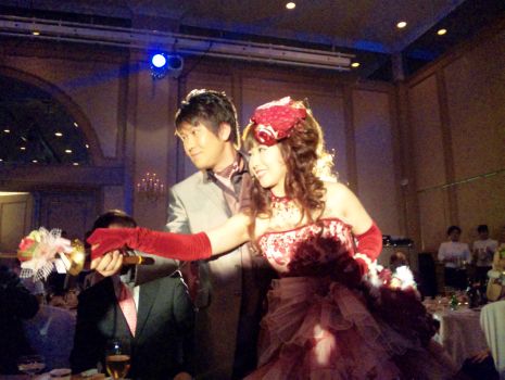 -今治国際ホテルで披露宴-『結婚式はイイね!』本日はJCでは同期入会だったのですが、各方面で活躍されているM先輩のご令嬢様の結婚式と披露宴が、「今治国際ホテル」さんでありました。。。なにしろ今治では有名人のM先輩、、、列席した面々は政界関係者や事業家、経済人など各方面から約250名、、、豪華絢爛の披露宴が12時から催されました。。。[キャンドルサービスの新郎新婦(キレイなのでボカシていません)]上の写真は後半のキャンドルサービスの時のものです、、、ブログではよく、ボカシなど入れたりするのですが、とてもキレイなのでそのまま掲載しました。。。(問題ナイですよネっ!)[寿太鼓のオープニング]M先輩もJC卒業なので、オープニングは"寿太鼓:春駒"です、、、因みに左から2番目にいるのは、当ブログでもお馴染みのhappy&fine-papaさんです。。。[鯛の尾頭付きの刺身やフォアグラ]そして料理はというと、、、なんと"鯛のお頭付の刺身"から始まりました、、、もちろん一人一匹づつです。。。またフォアグラもでてきました、、、なんと豪華な料理なんでしょう。。。[社員一同での余興]途中、社員の皆様の(ちょっとワカラナイ:笑)余興や、友人の皆様の挨拶や歌と続いていきますが、何しろ列席しているメンバーがメンバーなので、結婚式というよりは大宴会、、、、そこら中でお酒のつぎ合いがはじまり、もぅグッチャグチャの様子ですねぇ。。。[メインはステーキ]それでも私は食事をいただきます、、、メインは"ステーキ"です。これは食べておかなくっちゃイケマセン。。。ステージでは今年のダンスバリの優勝チームも、ダンスを披露してくれました、、、これはGOOD! 見応えがありました。。。[今年のダンスバリの優勝チーム]お寿司も食べて、デザートは2種類、、、12時に始まった披露宴なのにすでに3時半、、、久しぶりに時間の長い披露宴です。。。さすがに昼間から約3時間も飲み続けていると、酔っぱらいます、、、み~~んな赤い顔をしていましたヨ。。。[お寿司やデザート2種]さて最後になりましたが、本日ご結婚されたお二人の幸せ、そして両M家の皆様のご健勝とご繁栄を、心よりご祈念申し上げます。。。おめでとうございました~~っ!!