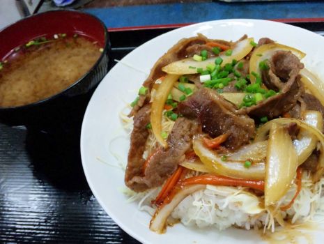 -本日の出前だヨ!-『焼き肉丼(マルダイ)』プチ遠征に出られない水曜日の恒例になりました、、、隣の「瀬戸内食堂 マルダイ:リンク多いのでたどってください」さんの出前です。。。[焼き肉丼:¥600→¥480]今日は"焼き肉丼"を注文しました、、、いつものように約5分で、お店に届けてくれましたねぇ、、、ありがたいコトです。。。が、今回は届いてちょっとビックリ、、、想像していた"焼き肉丼"とは全く違っていました。。。[アップで]丼ではなく大皿に盛られた大盛ご飯、その上に"キャベツ"が敷かれ、さらにその上に、焼き肉のタレで"玉ねぎ"や"にんじん"と一緒に炒められた"牛肉"がトッピングされていますねぇ。。。[いただきま~~すっ!]お味の方は、、、いわずもがな皆様の想像できる通りです。。。また正直言えば、、、バラバラにして"焼き肉定食"にした方が、食べやすかったかもしれません。。。