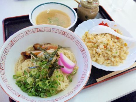 -ソロで行っていないプチ遠征記-『汁なしラーメン+ハーフ焼めし(とまと食堂)』本日は火曜日で愛大S先生との食事です、、、S先生は診察がてきぱきと早いので、1時前には午前の診療は終わりました。。。ちょっと時間もあるので、「とまと食堂:リンク多いのでたどってください」さんに足をのばしました。。。[汁なしラーメン:¥500+ハーフ焼めし:¥300]S先生は「とまと食堂」さんは初めてです、、、なのでぜひ召し上がっていただきたいのが、そう"汁なしラーメン"ですねぇ。。。今回は私も先生も、"汁なしラーメン"+"ハーフ焼めし"の注文をしました。。。[汁なしラーメン]店主さんがひとりで料理しているので、多少時間がかかります、、、それでも10分を過ぎるころには注文ができあがりました。。。"焼めし"はハーフなのに、スープは大きい器に入っていて、見栄えも豪華ですねぇ。。。[アップで]おやっ!?、、、"焼めし"の肉が、、、"焼豚"になっています。。。前回食べた時、"絶対、焼豚がイイっ!"と書いたので、、、今回、店主さんが"豚肉"でなく"焼豚"で作ってくれたそうです。。。ありがたいコトです。。。[ハーフ焼めし]さてお味の方は、、、"汁なしラーメン"はなんどもコメントしましたので、過去記事をご参照ください。。。なので今回は(ハーフだけど、、、)"焼めし"です。。。上述の通り、今回のみの特別な"焼豚焼めし"かもしれませんが、やっぱり"焼豚"はGOODです! 前回より格段に美味しいと思えました、、、この"焼めし"なら、食堂系としてはかなりのハイレベルと言えるのではないでしょうか!![各アップで]が~~っ、一点、、、"焼めし"のスープが、ちょっと塩っぱい、、、夏場で汗をかく仕事をしている人の、塩分補給にはイイかもしれませんが、我々室内族にとっては、塩分過剰摂取になりそうです。。。もう少しマイルドにして欲しいと思いましたねぇ。。。