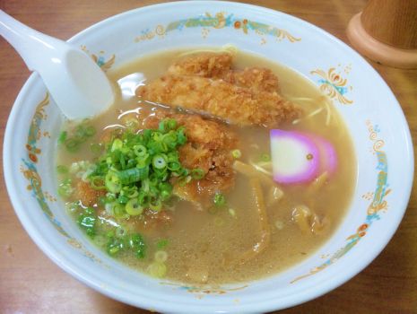 -ソロで行っていないプチ遠征記-『カツラーメン(お食事処たつ)』一昨日にひきつづき本日も愛大:S先生との食事です、、、今日はS先生が、久しぶりにカツのお店、「お食事処たつ:リンク多いのでたどってください」さんに行きたいということで、1時ころ訪れました。。。[カツラーメン:¥850]4人掛けのテーブル席は、かろうじて1つ空いていました、、、席に着き、今回は私も先生も"カツラーメン"を注文しました。。。デミグラスソースの"カツ丼"で有名なお店ですが、麺喰いの私は"カツラーメン"を注文することの方が多いのですねぇ。。。[さらにアップで]気になるお味の方は、過去記事をご参照ください、、、いつもながら美味しく、ボリュームも満点なので、これ一杯でおなかが膨れます。。。先生もカツのみでなく、ラーメンの美味しさにも驚かれていましたねぇ。。。[各アップで]そういえば、いつぞやのTV番組で"カツラーメン"は、高知県ではスタンダードなラーメンだということでした、、、今度高知に行ったら調査してみましょう。。。