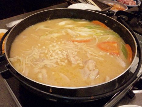 -ソロで行っていないプチ遠征記-『ハイカラ闇鍋(つつい)』今夜も後輩I.K.君のお店:「焼肉遊館つつい:リンク多いのでたどってください」さんで無尽でした、、、今月はもう何度来たのでしょう。。。[勝手に命名:ハイカラ闇鍋(仮称)]今日の料理は鍋、、、しかもよくわからない"アメリカン・ナントカ・・・"。。。今時"アメリカン"、、、って(笑)、なんか昭和っぽいネーミングですよねぇ。。。また入れる食材はなんでもOKだとか!?、、、まるで"闇鍋"みたいです。。。[食材は何でもOKだとか、、、]で、"アメリカン"ということなので勝手に命名しました。。。"ハイカラ闇鍋(仮称)"です、、、この記事を見ているI.K.君、、、そういうコトだから、ヨロシクっ!![いろいろ入れました。。。]"焼豚"や"ベーコン"、"鮭のハラス"などを入れていただきました、、、味はクリーミーで、"豆乳鍋"や"牛乳鍋"のような感じです、、、私的には好きな味で、美味しくいただきましたねぇ。。。