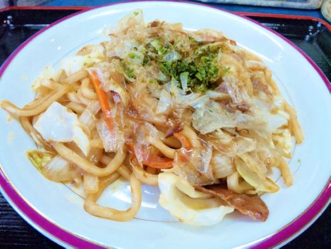 -いつもの出前!-『焼きうどん(マルダイ)』昨日のお昼に食べたのですが、ちょっと忙しくてUPできていませんでした、、、というのもお店の従業員さんが、ご親戚の結婚式に出るため、東京に行っています。。。なので、一人でバタバタしていて、隣の「瀬戸内食堂 マルダイ:リンク多いのでたどってください」さんに、いつもの出前をお願いしました。。。[焼きうどん:¥400→¥320]さてお願いしたまでは良かったのですが、届けてもらってからお客さんが数組来店されたので、食べるころにはスッカリ冷めてしまっていました、、、なので花鰹が踊るような綺麗な写真ではありません。。。また味の方の評価もビミョ~~になってしまいますので、次回、温かいのを食べたときに詳細をコメントしますネ。。。[アップで(ちょっとピンボケ)]ただ、冷めてもモチモチのうどんだったことと、1.5玉はあろうかというボリュームで、320円という超破格値だったことをまず報告しておきますねぇ。。。