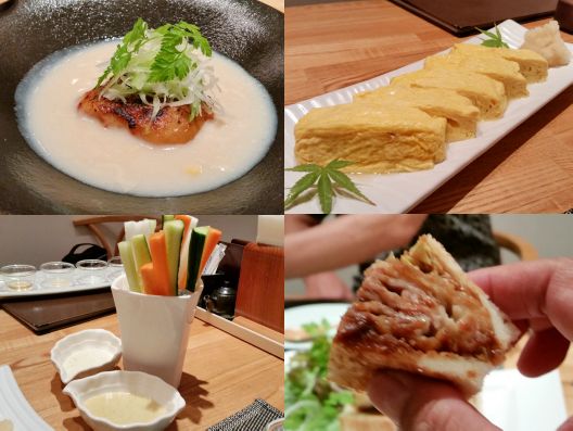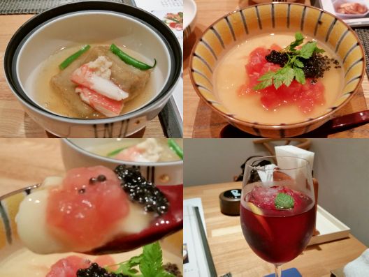 まず"茄子豆腐"ができあがりました、、、ほぅほぅ麻婆茄子のようなものを想像していましたが、茄子を豆腐に練り込んでいるそうです。。。モッチリとした食感で、ごま豆腐やしんじょうのような感じです。。。また"冷し茶碗蒸し"は卵豆腐のようで、、、トッピングされたトマトの酸味とキャビアの塩気をしっかり感じます。。。