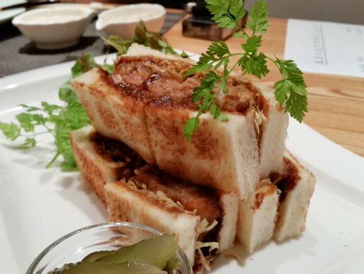 そして"真鯛の葱味噌焼き"は、出汁入りのコーンスープに浮かんだ島のようです、葱味噌の香りがGOOD!! "ふわふわ出汁巻き"は、ほんとにフワフワ~っ!! 和風、、、しかも京風のテイストがプンプンです。。。そしてシメには"肉厚カツサンド"~をいただきました、、、おおぉぉぉ、ボリューミーな肉に、濃厚なデミグラスソースが最高っ!! うんうん、旨い旨い~☆