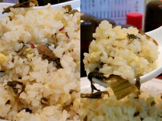 さぁ気になるお味、、、まずは"たか菜チャーハン"。。。ほどよくフワっとしたチャーハンに、ややピリ辛の"たか菜"が、シコシコとアクセントを加えます、、、私は"たか菜"が大好きなのですねぇ。。。うんうん、旨い旨い~☆