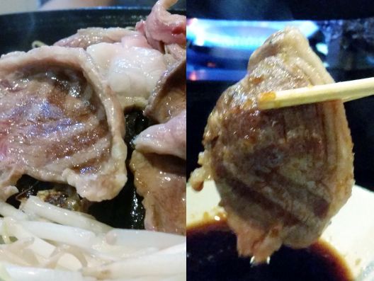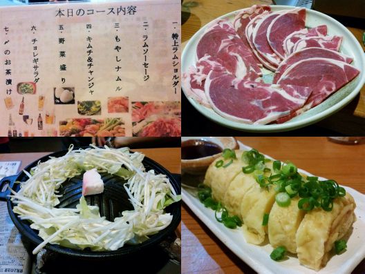 ほどなくして肉や料理が出てきました、、、大きな"特上ラムショルダー"は、ちゃんと肉厚もあります。。。私的に今まで食べた"ジンギスカン"は、ヘラヘラの薄い肉や、冷凍されていて、焼くと匂いの出る肉のイメージでしたが、この「ひつじ家」さんのものは、まったく匂いなどありません、、、芳ばしく焼き上がる、よい香りですねぇ。。。