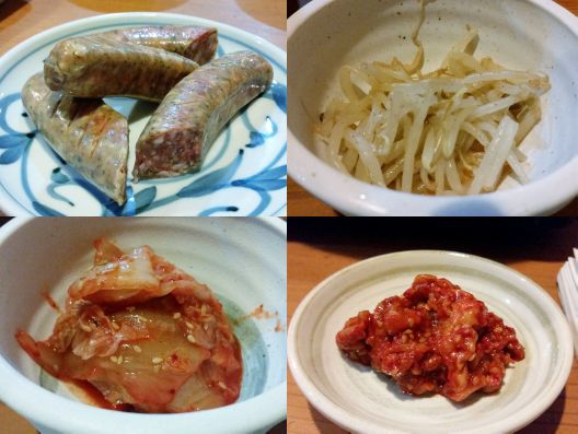 [ラムソーセージ、もんしナムル、キムチ、チャンジャ]