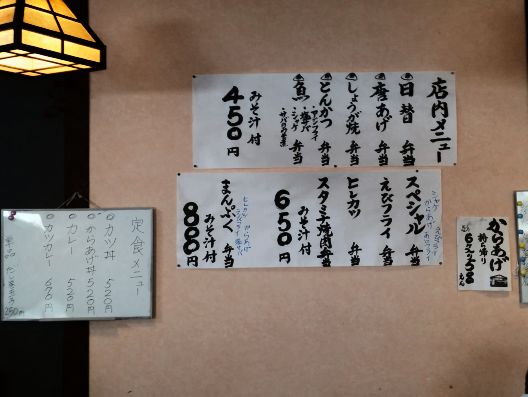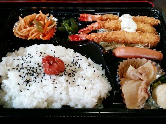 私は店内に入りいつもの席に、、、おや!? メニューが変更されています。。。すると女将さんがやって来て、なんでもお弁当のイートイン・スタイルに変更されたそうです、、、ほぅほぅ、確かにお弁当を提供しているお店ですので、その方が営業しやすいのでしょう。。。そこで私は"えびフライ弁当"を注文です、、、やがて待つこと約5分でできあがりました。。。