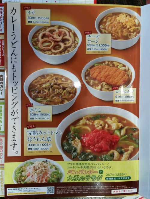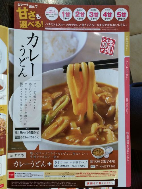 さてさすがにこの時間、他にお客さんはいませんでしたので、一人ですが4人掛けのテーブル席に座りました、、、そして店員さんに"カレーラーメン"を聞いてみると、ガーーンっ!! 北日吉店では扱っていないそうです。。。まぁそれでもイイでしょう、、、私的に気に入っている"カレーうどん"が再開されていましたので。。。