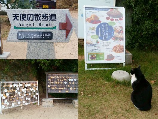 さて寒霞渓をで2キロ以上歩いたので、お腹が少し減ってきました、、、なので今度はラーメン屋さん(別記事報告します)に行って、その後、潮が引くとあらわれると言う"エンジェルロード"にやって来ました。。。でも事前に潮見表を確認しておらず、我々が到着した時間は満潮に向かって潮が満ちた状態、、、当然、"エンジェルロード"は見られませんでしたねぇ。。。ただ"エンジェルロード"の前の「エンジェルカフェ」さんの入り口で、"今日のお昼なん食べる?"の看板の前で、逃げもせず悩んでいる猫ちゃんに、ちょっと癒されましたねぇ。。。