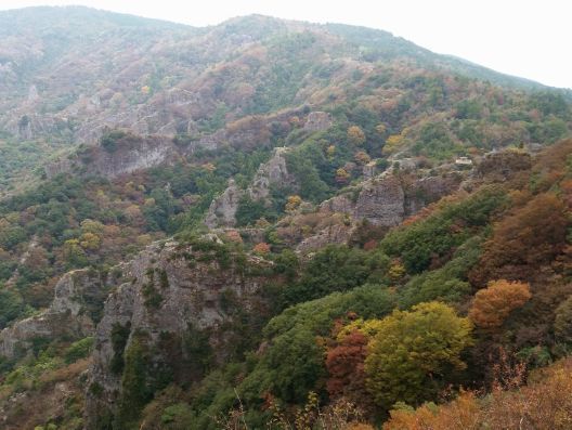 それでも山頂から望む景色は絶景絶景っ!! ただまだあまり紅葉が見られません、、、ちょっと早かったかなあぁぁぁ。。。そして我々は日頃の運動不足解消と、、、オススメのハイキングコースと言うHP情報で、"表12景登山道"から下山することにしました。。。でーーもっ、、、クネクネの登山道(下山)は木が高く、鬱蒼とした森を歩いているようだし、景色はほとんど見えないしで最悪。。。骨折り損の草臥れ儲けで、誰一人歩いていませんでしたねぇ。。。これから行かれる方、、、帰りもロープウェイをオススメします!!