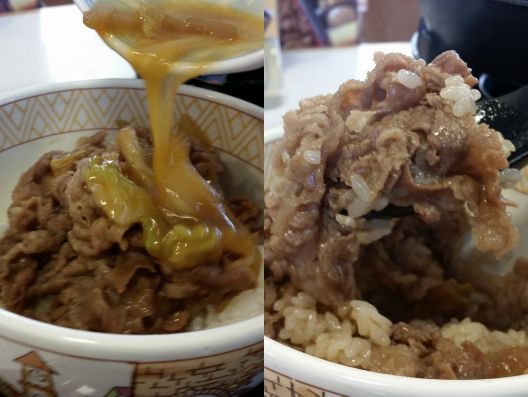 しかも肉2倍盛なので、野菜やうどんを食べ終えても、まだ肉が残っています、、、なのでご飯に余りの肉をトッピング、そして割り下をレンゲですくい掛け、最後に溶き卵を流し込みます。。。これでミニ"牛丼"の完成です!! うんうん、こちらも旨い旨い~~♪