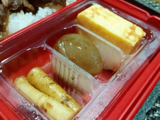 ただ付合せが残念、、、"甘い玉子焼"と"ぴり辛コンニャク"、"ゴボウ"の三品です。。。焼肉味の牛肉弁当なので、、、"キムチ"とか"ナムル"とかの方が合うんじゃぁないかなあぁぁぁ。。。と言うことで、私的には880円位のレベルで、箱代が200円の弁当かな!?
