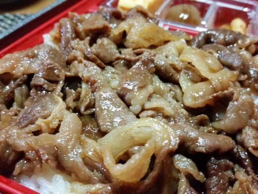 さぁ気になるお味です。。。まず肝心の肉は、、、おおぉぉぉ、確かに牛丼の肉より、やや厚みがあっても柔らかい。。。またタレは甘すぎない焼肉のタレ味でGOODでしょう!! ただ国産黒毛和牛かどうかは、言われなくては分からないでしょうけどねぇ、、、うんうん、旨い旨い~☆