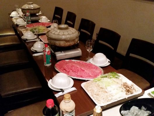 午後7時からの開会でしたが、私は少し遅れて7時10分頃に到着しました、、、でもまだみんな揃っていません、5人くらいですねぇ。。。そしてその後、少しずつメンバーがやってきて、、、午後8時前ころから鍋に火が入りました。。。