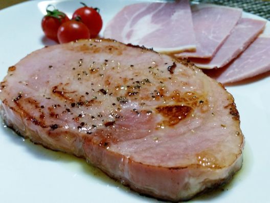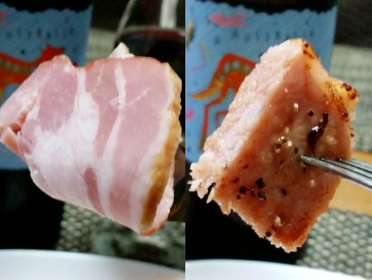 さて内容は"熟成ロースハム"と"直火焼き焼豚"、"熟成網焼きミートローフ"と三種類入ったセットでしたが、今回チョイスしたのは"熟成ロースハム"、、、薄切りスライスにして生と、1.5cm幅で切って、ハムステーキでいただくことにしました。。。