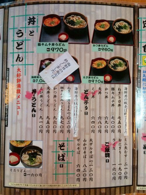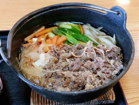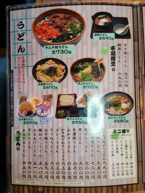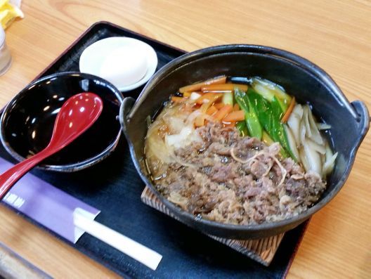12時過ぎに入店すると、店内には10人以上のお客さんが座っていました、、、それでも広い店内なので、席もたくさん空いています。。。我々はテーブル席に着き、私は"すき焼うどん"と"ミニ天むす"を、家内は"鍋焼うどん"をお願いしました、、、今日は朝から雪がちらつく寒い日なので、アツアツのうどんがGOODでしょう!! やがて待つこと約8分、、、注文ができあがりました