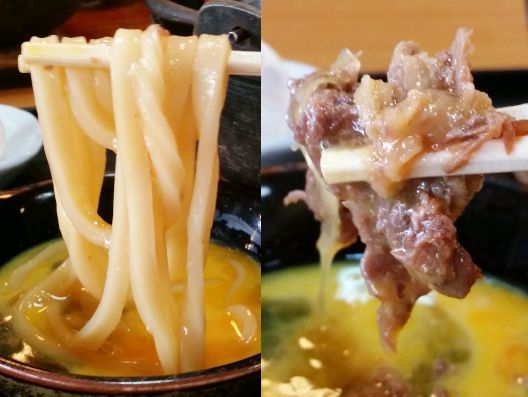 そして出汁はすき焼タイプなので、やや甘目の"肉うどん"タイプの出汁でしょう、、、生卵が付いているので溶いてそちらに浸けて、トロツル~っといただきます。。。うんうん、旨い旨い~☆