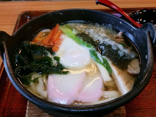 最後に家内の食べた"鍋焼うどん"。。。こちらは出汁が違います、、、ほんのり甘い香りのする魚介系出汁でしょう。。。クセのない優しい味ですねぇ、、、うんうん、こちらも美味しいっ!!