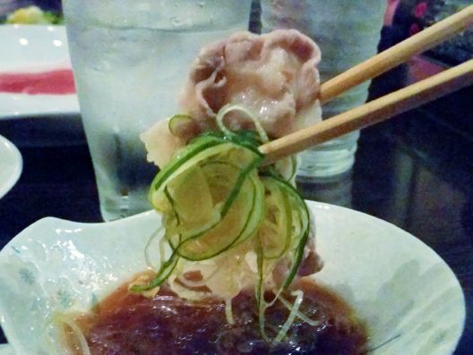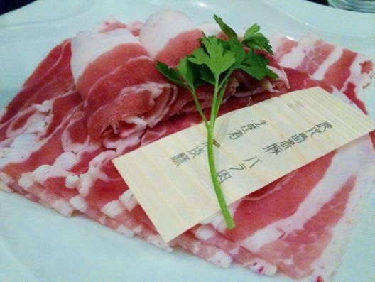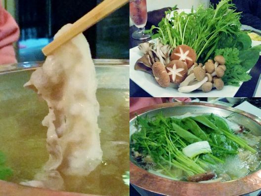 やがて"鹿児島黒豚 バラ肉"が出てきて、しゃぶしゃぶの始まりです!! まず私は鍋に何もいれずしゃぶしゃぶしゃぶ、、、素の肉の味を濁さないよう、ちょっとだけゆずポン酢に浸していただきます。。。おおぉぉぉ、アッサリだけどコクのある、クセのない豚肉です!!