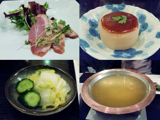 さて店内には靴を脱いで上がります、、、長い廊下沿いに黒基調のシックな部屋が並んでいますねぇ。。。飲み放題のコースでお願いしていましたが、ワイン(赤・白)もOKでした、、、また今夜は女将さん一人だったようで、料理は順に、ゆっくりと運ばれてきました。。。最初に出てきたプリンのように見えるのは、"風呂吹き大根"ですネ、、、アツアツで、出汁がよく浸みていて美味しいっ!!