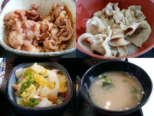 おやっ!? てっきり丼に"牛豚"がトッピングされてくるものだと思っていたら、別々に出てきました、、、どうやら自分で好きなようにトッピングするようです。。。もちろん私は両方をトッピングしましたねぇ、、、これでHPと同じ"牛豚 半丼 アタマの大盛"になりました。。。