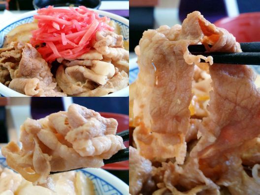さぁ気になるお味です。。。と言っても、、、皆様がよく知る「吉野家」さんの"牛丼"と"豚丼"の味です。。。ただ単品で"牛丼 アタマの大盛"だと480円、、、"豚丼 アタマの大盛"だと430円、、、この"牛豚 半丼 アタマの大盛"は450円なので、ちょっとだけ徳した気分ですねぇ。。。うんうん、旨い旨い~☆