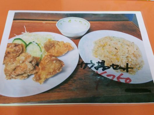 今日のお昼はいつもより少し早く、12時50分ころに暖簾をくぐりました、、、店内には何人かお客さんが座っていましたが、すでに食事をしています。。。一人の私はカウンター席に着き"カラ揚セット"を発注です、、、そして待つこと約8分でできあがりました。。。