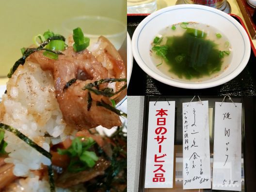 午後1時20分ころにやって来ました、、、まずは入り口で"本日のサービス品"を確認です。。。おっ、"焼肉ピラフ"、、、うんうん、ちょっと肉が食べたい気分でしたので、それにしましょう!! 入店してカウンター席に着き、"焼肉ピラフ"を注文です、、、今日は空いていたので、待つこと約6分でできあがりました。。。