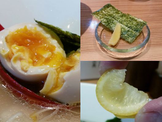 またトッピングは、アッサリの鶏チャーシューがタップリと、カマボコ、ネギ、三つ葉、昆布、味玉、別皿の海苔とレモン、、、麺を半分くらいいただいたところで、レモンをギュッと絞ってトッピングします。。。うんうん、スープに酸味が加わり、ますます爽やかに、、、うんうん、旨い旨い~☆