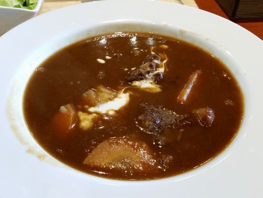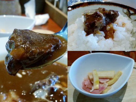 さぁ気になるお味です。。。3~4cm角の牛肉が3、4個、ゴロゴロとデミグラスソースに浮かんでいます、、、それ以外にもジャガイモやニンジンもゴ~ロゴロ。。。うんうん、私はこんなゴロゴロの塊具材が好きなのです、、、牛肉はよ~く煮込まれていて、舌で押しつぶせる位ですし、デミグラスソースは、ほんのり酸味のあるコクのソースでしょう。。。パンとライスを選ぶことができましたが、私はやっぱりライス、、、その上にトロトロの牛肉をバウンドさせていただきます!! うんうん、旨い旨い~☆