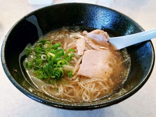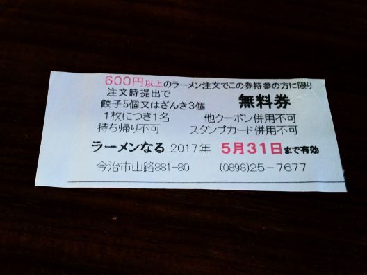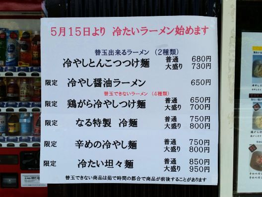 前回訪問時にもらった"餃子orざんきの無料券"が5月末までだったのと、"冷やしラーメン"の幟が立っていたので、今日のお昼は「ラーメン なる: リンク多いのでたどってください 」さんに行きました、、、午後1時過ぎの訪問でしたねぇ。。。