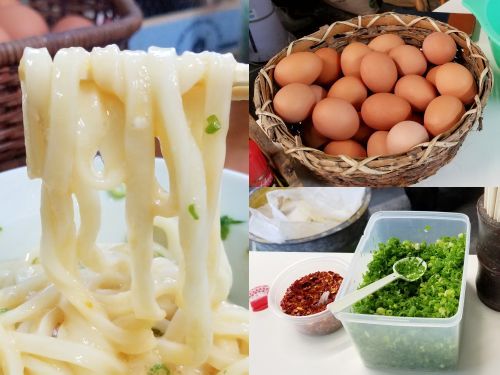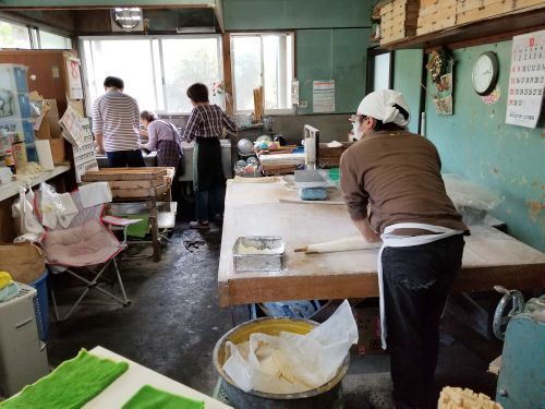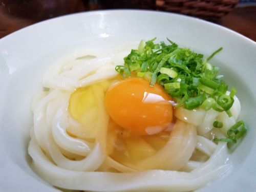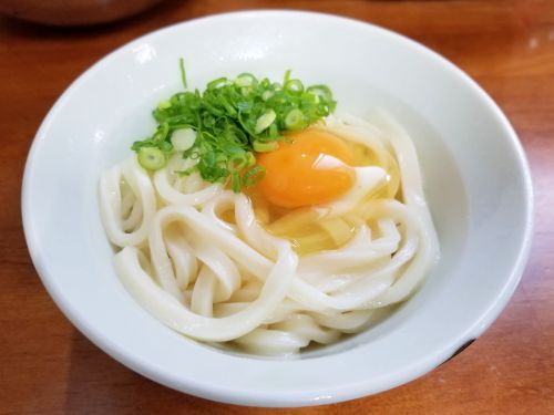 お昼としては遅い時間でしたが、我々以外にも10人近いお客さんがいます、、、でも店内以外にも外で食べている人もいたので、我々は"温つ"をお願いして席に着きました。。。そうそう「三嶋製麺所」さんのメニューは、温つか冷やかのうどん(大、小)と、たまご、ネギ、しょうゆ、唐辛子しかありません、、、それ以外の味付けを好むなら、持参がお約束です。。。